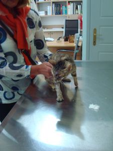 Im Jahre 2009 fanden wir auf Mykonos eine schwer verletzte Katze. Bei dem Tierarzt vor Ort, Nicos Triantafylloy liessen wir das